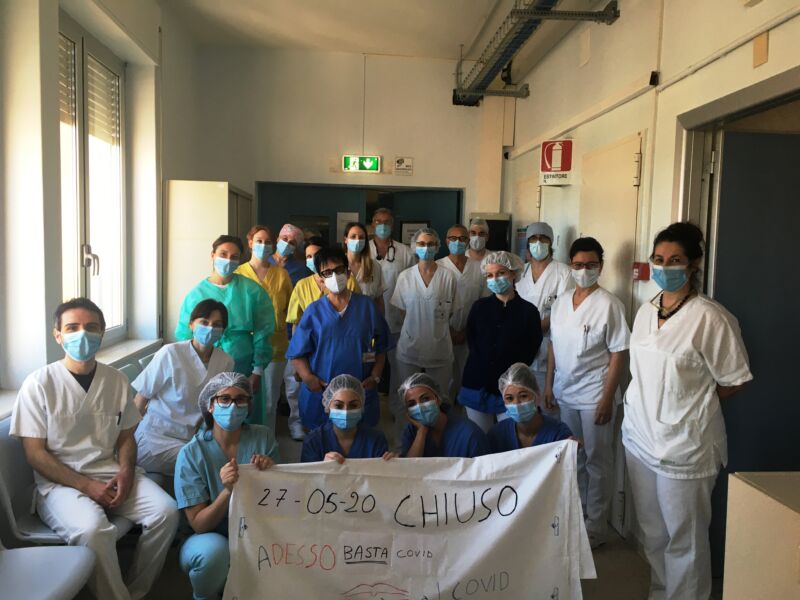 Ieri è stato chiuso il reparto covid di Medicina Interna al sesto piano dell’ospedale Bufalini di Cesena. Trasformato a inizio emergenza in area covid 19 esclusivamente dedicata alla cura e all’assistenza di malati di coronavirus , dopo circa tre mesi, il reparto è pronto per tornare a poco a poco alla sua normale funzione.