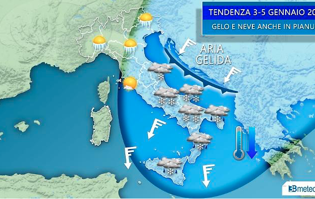“Confermata una irruzione di aria molto fredda di matrice artica sull’Italia dal 2 gennaio, con apice tra il 3 e il 4 gennaio, che prenderà piede da Scandinavia e nord Russia dilagando verso Balcani e Mediterraneo centrale” – avverte il meteorologo di 3bmeteo.com Edoardo Ferrara che spiega – “le temperature saranno in tracollo anche di oltre 10°C sotto venti forti di Tramontana, Grecale e Maestrale, in particolare su Alpi e Appennino, dove si potranno avere giornate di ghiaccio con massime sottozero o prossime ad esso, ma anche lungo le adriatiche dove le temperature diurne potrebbero non superare i 3-4°C, dalla Romagna alla Puglia. La sensazione di freddo verrà inoltre accentuata dal vento, che come detto soffierà teso dai quadranti settentrionali, con raffiche anche di oltre 50-60km/h lungo le coste, superiori in montagna. A 1500m su Alpi specie orientali e dorsale adriatica sono attesi valori sino a -10/-12°C a 1500m, inferiori sulle Dolomiti.”