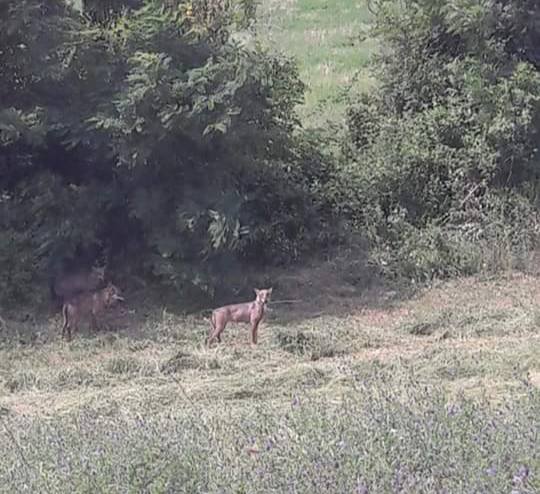 Tre lupi, forse in cerca di acqua nelle campagne, due dei quali all’ombra della vegetazione. La foto è stata scattata oggi venerdì pomeriggio 27 luglio 2018 da Valerio Casali che l’ha postata su Facebook e si augura che i lupi facciano un buon lavoro con i cinghiali.