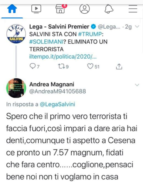 Andrea Magnani, che poche ore dopo è sparito dal web, ha scritto un chiaro messaggio di morte con un italiano pieno di errori grammaticali, ma con un senso ben preciso e cioè che se Salvini andava a Cesena sarebbe stato ucciso con una pistola 7.57 magnum.