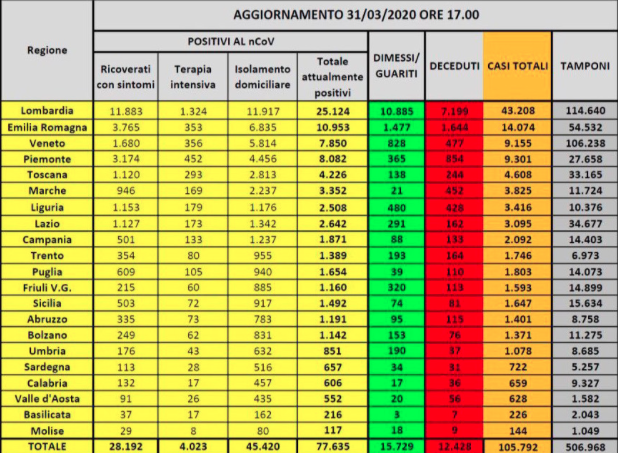 Sono 14.074 casi di positività al Coronavirus in Emilia-Romagna, 543 in più rispetto a ieri; 54.532 i test effettuati,3.542 in più. Questi i dati – accertati alle ore 12 di oggi, martedì 31 marzo, sulla base delle richieste istituzionali – relativi all’andamento dell’epidemia in regione.