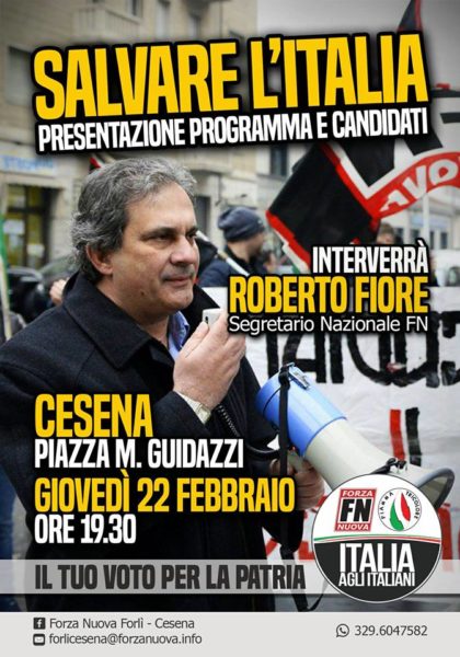 Roberto Fiore, segretario di Forza Nuova sarà a Cesena domani giovedì 22 febbraio alle 19.30 in piazza Guidazzi dove presenterà i candidati e il programma per le elezioni politiche del 4 marzo. Cesena è presente tra le tappe romagnole inserite nella campagna elettorale del segretario candidato alla presidenza per la lista “Italia agli Italiani’.