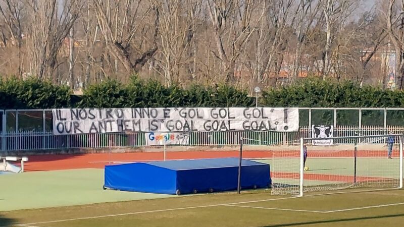 NIENTE MAMELI – In attesa del posticipo, dunque, Cesena a un punto dalla Regia. Mentre la Virtus Entella – ieri bloccata sul pari ad Olbia ed ora sprofondata a -4 da Bianchi & Friends – sembra al momento fuori dai giochi. Intanto, la testa del popolo bianconero, è già a lunedì prossimo. Quando, nell’infuocato catino del Manuzzi, andrà in scena l’atteso derby con la band di Diana. Ci sarà da divertirsi, fra 8 giorni. E da cantare. Ovviamente l’evergreen di Lucio Cesenatico. Come sottolineato (anche) oggi dai tifosi bianconeri presenti al Galli di Imola con il loro azzeccatissimo striscione ‘Il nostro inno è Gol Gol Gol (Cesena Gol Gol Gol, ndr)’. Uno striscione che – per tutti coloro che l’italiano, ehm ehm, lo masticano poco – è stato pure tradotto in inglese.
