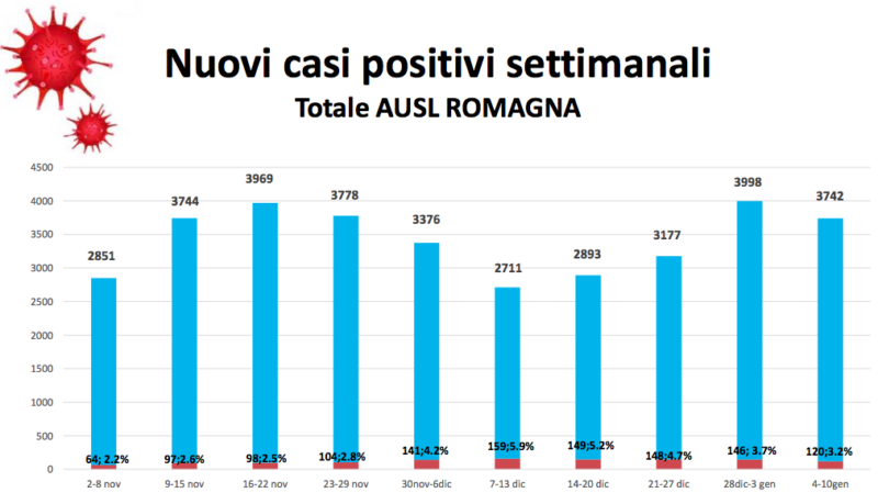 Al fine di fornire un aggiornamento rispetto all’evoluzione del quadro epidemiologico dell’infezione da covid 19 nel territorio romagnolo, su un arco temporale più significativo rispetto alla situazione di una singola giornata, si riportano, in allegato, alcuni dati relativi alla settimana dal 4 al 10 gennaio (precisando che si tratta dei casi di residenti diagnosticati sul territorio romagnolo).