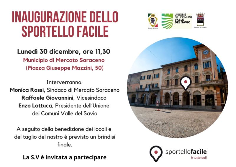 Lunedì 30 dicembre alle 11.30 in piazza Mazzini. Con l’apertura dello Sportello Facile i servizi offerti dal Comune di Mercato Saraceno ai cittadini saranno più smart e più veloci.