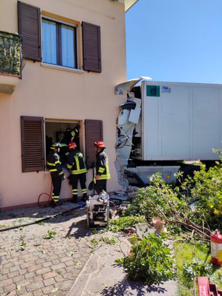 Sul posto squadre dal Distaccamento Vigili del Fuoco di Cesena e dalla sede centrale per soccorrere un camionista bloccato nella cabina del proprio camion dopo esser uscito di strada ed aver urtato un abitazione.