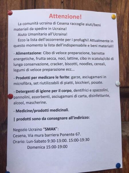 In particolare a Forlì e Cesena presso i negozi “Smak” (piazza del Carmine, 13 a Forlì e via Mura barriera ponente, 67 a Cesena) e Mix Markt (viale Vittorio Veneto, 94 a Forlì) si raccolgono i seguenti beni, gestiti direttamente dalla comunità ucraina: