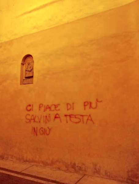 “Ci piace di più Salvini a testa in giù”. Questa la scritta apparsa a Cesena a Porta Santi. Imbrattato il muro interno della porta. Probabilmente chi ha scritto lo ha fatto di notte quando il luogo è abbastanza deserto.
