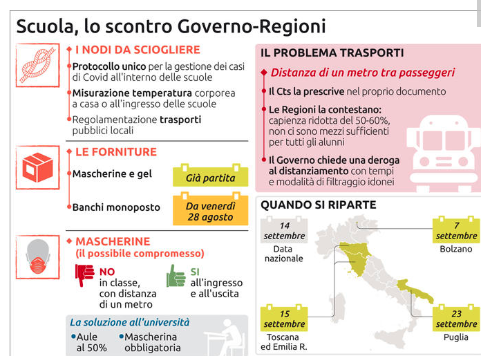 Un deciso “no” alle mascherine in classe e un avvertimento: “impossibile ripartire così senza evitare il caos dei trasporti, perché in molti rischiano di non raggiungere istituti o luoghi di lavoro”. E’ un dialogo difficile quello tra Regioni e governo, che non hanno ancora trovato la quadra su scuolabus e dispositivi di protezione in vista dell’inizio delle lezioni e della ripresa delle attività. Dopo il vertice dei governatori con i ministri Boccia, De Michelis, Speranza e Azzolina, emerge la necessità di un coordinamento permanente, in particolare sul nodo del trasporto pubblico locale su cui pesa il continuo braccio di ferro tra le Regioni, che puntano a ‘viaggiare’ a pieno carico, e il Comitato Tecnico Scientifico. Sul tavolo ci sono le proposte dei territori vagliate in queste con un po’ di scetticismo dagli scienziati, i quali godono del pieno appoggio del ministro della Salute.