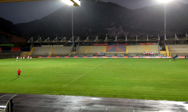 INSULTI – Brutta (anzi, bruttissima) partita, quella andata in scena oggi in terra umbra. Su un campo infame reso pesante dalle abbondanti piogge cadute nelle ultime ore. Poco calcio ‘vero’ (giocate da Eccellenza, tanto per farci capire…), qualche ‘pirlata’ di troppo (vedi il secondo giallo beccato da Cesaretti nel primo tempo, vedi il contropiede gettato alle ortiche nel finale di gara da Sarao ), tanto nervosismo di matrice locale (bravo Modesto a togliere dal campo Capellini, che stava quasi rischiando il linciaccio…), tanto malcontento in tribuna (diversi gli insulti coloriti fatti partire all’indirizzo dell’arbitro, il davvero modestissimo Nicolini di Brescia): ecco il riassunto di questo pre-serata di metà novembre consumatasi al ‘Barbetti’.