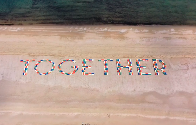 Flash-mob degli operatori balneari di Cesenatico. Ieri pomeriggio i gestori di tre stabilimenti della zona di Levante hanno composto con i loro lettini una scritta lunga 120 metri, poi ripresa da un drone, che formava la parola ‘together’, insieme. Il nome dell’iniziativa è ‘Together – 301 lettini’.