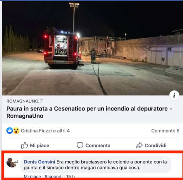 Vergognoso commento di un utente Facebook che nel grande gruppo di Cesenatico, sotto alla notizia dell’incendio di ieri sera, venerdì 21 giugno, del depuratore di Cesenatico, augura al sindaco che si era recato sul posto di bruciare insieme alla Giunta.