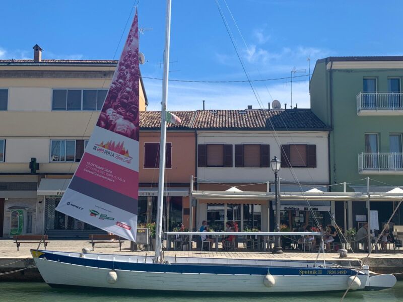 La tappa del Giro d’Italia che il 15 ottobre 2020 partirà e arriverà a Cesenatico è molto più che semplice ciclismo: è un’opportunità per la città, un momento di ritrovo e anche di ricordo, una data simbolica da cui ripartire per una Cesenatico che sta diventando sempre di più città della bicicletta. Per le grandi occasioni anche l’occhio vuole la sua parte e così l’Amministrazione Comunale in sinergia con il Comitato di Tappa e il G.C Fausto Coppi ha messo e sta mettendo in opera un dressing rosa di tutta la città: in questi giorni su una delle barche del Porto Canale è apparsa una vela speciale. L’opera, issata sull’imbarcazione “Sputnik II”, riprende graficamente la data della tappa ribadendo il legame del passaggio del Giro con la Nove Colli ed è impreziosita dall’altimetria stilizzata del percorso. Una vela rosa che campeggia così in uno dei punti storici di Cesenatico a simboleggiare il legame di ogni angolo della città con questo grande evento che sta arrivando.