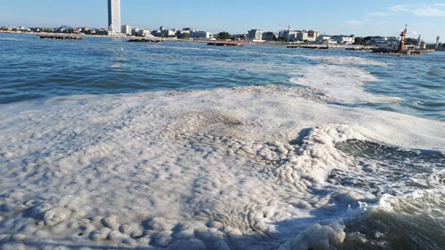L´avvistamento lungo la battigia di schiume bianche di dimensioni contenute è un fenomeno ricorrente, anche se non frequente. Dette “schiume” in mare sono spesso dovute alla sostanza organica particellata presente nell´acqua di mare (generata dall’intenso fenomeno eutrofico) che viene trasformata “montata” in schiume per azione del moto ondoso e del vento. Questa “trasformazione” si realizza più frequentemente in prossimità di substrati duri (nel nostro caso scogliere frangiflutto, pennelli portuali, massi di protezione) ed in maniera più evidente dopo mareggiate. Le schiume così formate persistono anche per giorni ed è possibile avvistarle “spiaggiate” anche in giornate di calma piatta. Il loro destino è comunque quello di smontarsi e quindi sciogliersi nuovamente in acqua. In pratica sono tensioattivi di origine naturale.
