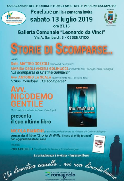 Dopo i saluti del sindaco Matteo Gozzoli parleranno Marisa Degli Angeli Golinucci, presidente dell’Associazione Penelepe Emilia Romagna su “La scomparsa di Cristina Golinucci“. Sarà poi la volta dell’Avvocato Antonio La Scala, già presidente dell’Associazione Penelope che parlerà dell’associazione e delle scomparse.
