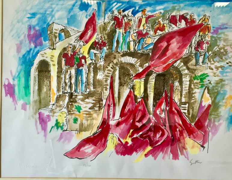 E proprio su questa scia, nei locali climatizzati che ospitano una delle più belle ed antiche esposizioni d’arte, ritroviamo nella raccolta di disegni e acquerelli, una delle opere del “Gott mit Uns” (1944) che richiama ai fucilati, ai civili e passati per le armi del secondo conflitto mondiale, ed una che rimanda all’impegno ed all’interesse politico dell’artista: un trionfo di bandiere sventolanti in cui esplode il colore rosso a richiamo delle lotte sociali a lui tanto care che ne hanno fatto il capofila della cosiddetta arte sociale (opera in foto). Oltre agli immancabili “tetti di capri” un olio che richiama la passione dell’artista per i tetti delle città, “Le visite” (1970), acrilico su carta incollata su compensato, presente nel catalogo generale delle opere di Guttuso ed esposto nelle più importanti mostre internazionali dedicate al Maestro, e “Caminetto” (1984), un olio su tela di importanti dimensioni, ed una natura morta del 1938 dal titolo “Due Garofani”.