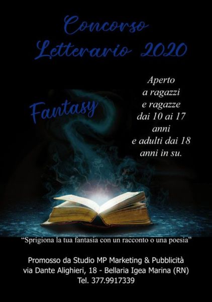 Continuano le iscrizioni alla prima edizione del Concorso Letterario “Fantasy” promosso da Romina di Studio MP Marketing & Pubblicità. Si può partecipare con un racconto o una poesia il cui argomento è libero proprio per dare via libera alla fantasia e alla creatività. È rivolto a due fasce di età: dai 10 ai 17 anni (gratuito) e adulti, con una piccola quota di partecipazione. Per tutte le informazioni necessarie, contatti 377.9917339 – studiomp.bellaria@gmail.com