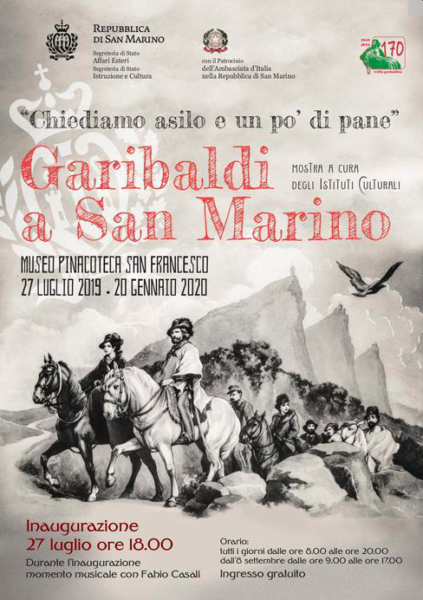 Inaugura sabato 27 luglio (ore 18) al Museo Pinacoteca San Francesco la mostra ‘Chiediamo asilo e un po’ di pane. Garibaldi a San Marino’, a cura degli Istituti Culturali (Archivio di Stato, Biblioteca di Stato, Musei di Stato).