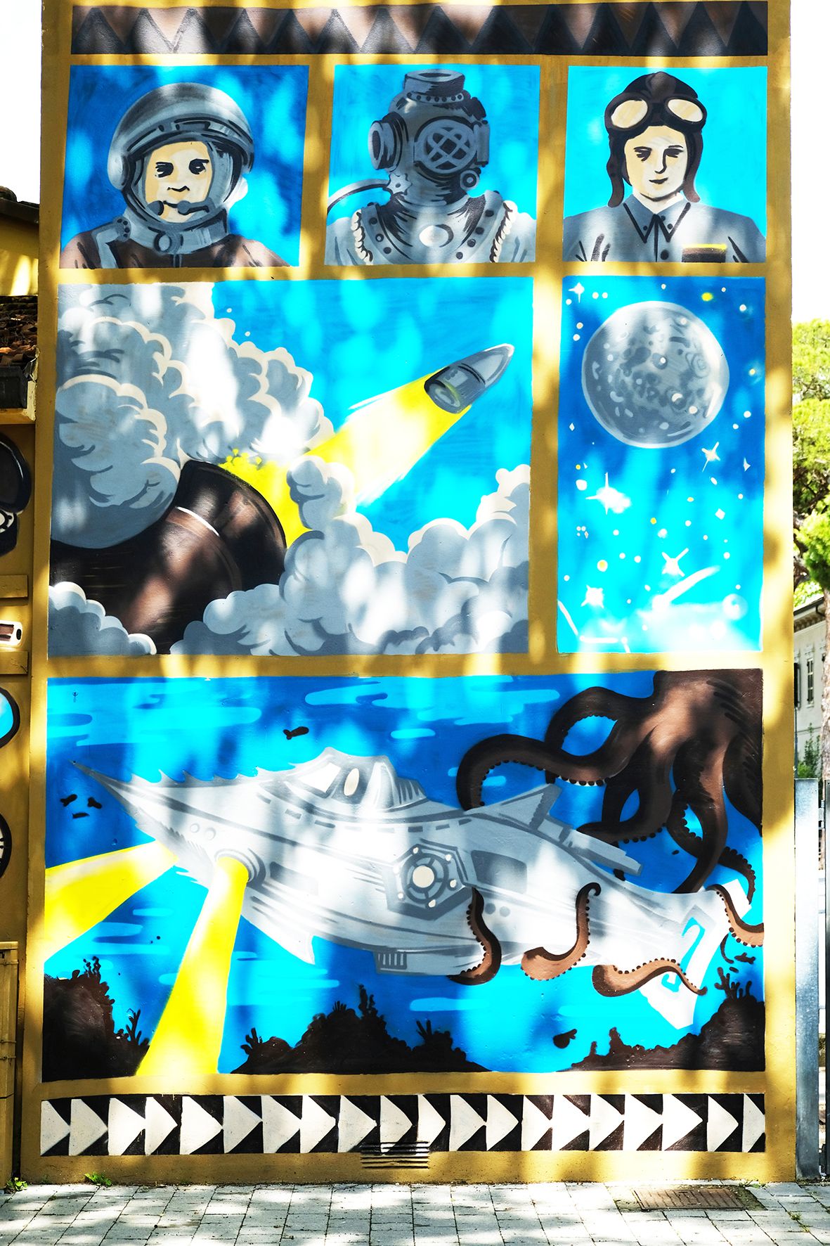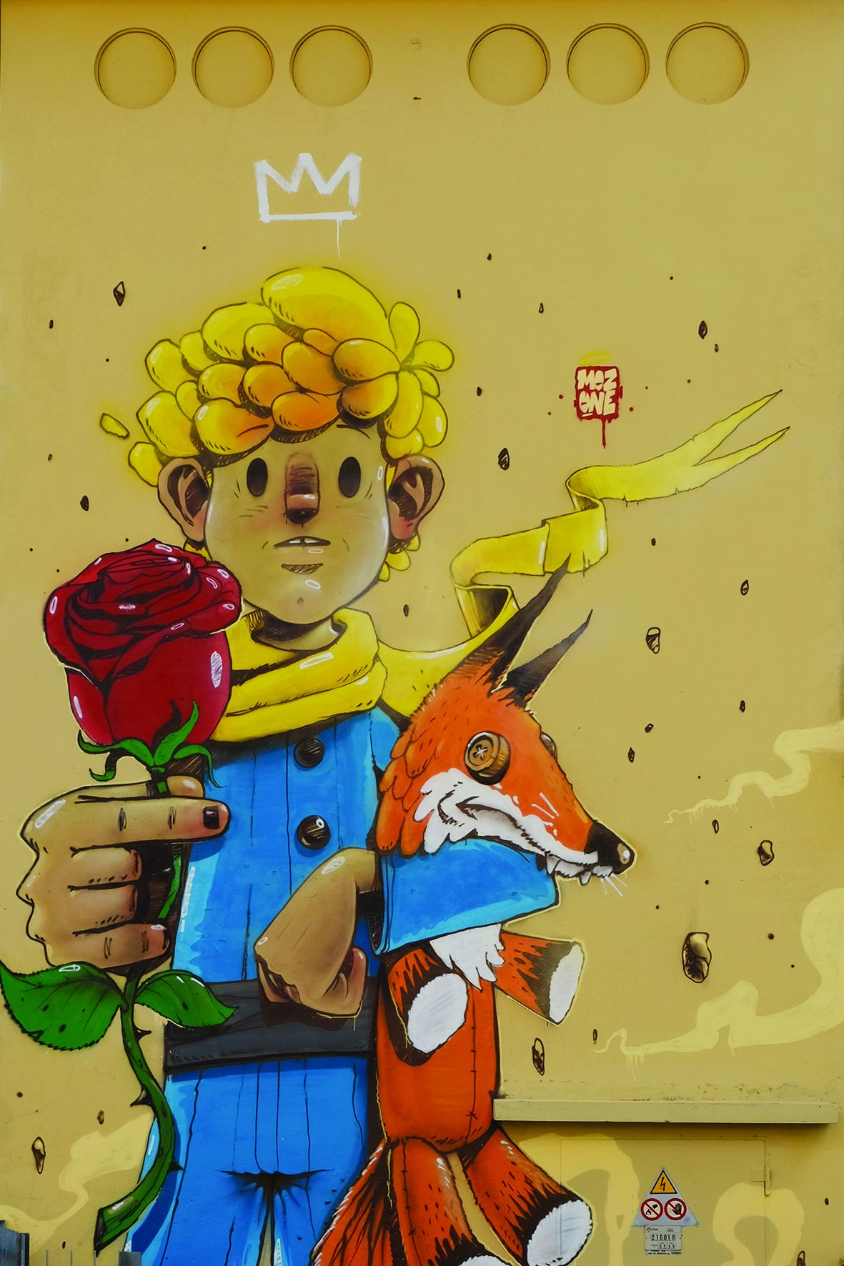 Infine un altro artista riminese, “Mozone” ha dipinto sulla cabina Enel “ Il Piccolo principe” con la sua piccola volpe. Dedicato a: agli scolari di un tempo che tornano, da adulti, in questo Vialetto, per fare sport nelle due palestre scolastiche o per seguire le lezioni nella scuola di musica Rossini.