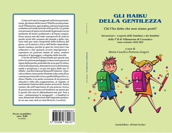 Non smettono mai di stupire, i venti alunni della Classe Terza B della Scuola Primaria di Villamarina di Cesenatico dell’anno scolastico 2022/2023. Dopo aver ‘lavorato’ alacremente lo scorso febbraio sulla canzone portata al Festival di Sanremo da Mr Rain (un’iniziativa che ha riscosso una vagonata di consensi, anche sul web), ora i baby artisti di Villamarina ci hanno preso gusto. E, coordinati dall’infaticabile insegnante Moira Cascili e dall’inossidabile Vicepreside Patrizia Gregori, hanno scritto il loro primo attesissimo libro. Un libro intitolato Gli haiku della gentilezza – Chi l’ha detto che non siamo poeti? “Tale libro è solo la punta dell’iceberg di un ben più ampio progetto improntato sulla promozione universale della gentilezza – dicono all’unisono le redattrici Cascili e Gregori – e contiene una cinquantina di versi poetici giapponesi scritti dai nostri bambini. La stesura congiunta di questa opera ha affascinato sin da subito i nostri piccoli poeti. Crediamo fermamente che occorra investire sui bambini. Bisogna ripartire da loro per costruire un mondo migliore. E questo libro ricco di passione può essere davvero un ‘piccolo’ grande punto di partenza…”. Tale pubblicazione, edita da Il Ponte Vecchio di Cesena, sarà in vendita da oggi – giovedì 11 maggio – al prezzo speciale di 8 euro presso la Libreria Cartamarea di Cesenatico (Viale Baldini 26). Oppure, sabato 20 maggio, direttamente alla Scuola Primaria di Villamarina. In occasione della festa delle famiglie di fine anno.