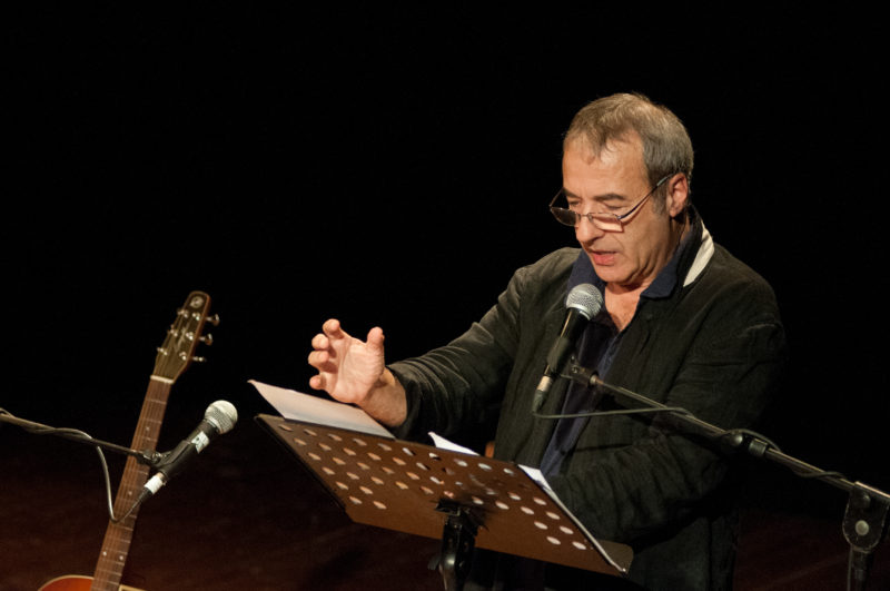 “Uno dei problemi più complessi della fine del Novecento e dell’inizio del millennio è il titolo da dare agli incontri col pubblico di autori che tendono a saltare di palo in frasca. Che già sarebbe un buon titolo. Più semplice dire che apro il sipario, espongo il banchetto e metto in mostra la mia merce: racconti in versi, canzoni più o meno lunghe e più o meno serie, più o meno autentiche e più o meno parodistiche. Un diario in musica, che fotografa questi primi anni del millennio, nei suoi passaggi più evidenti: diciamo dal pianto della Fornero (come non farci su un poemetto?) alla enigmatica ascesa di Renzi (che scopriamo essere un acrostico, ossia un cognome di cinque lettere ognuna delle quali è l’iniziale di una parola, ed ecco spiegato il mistero e chi più ne sa più ne metta). Questi anni di crisi, insomma, raccontati a partire dalle canzoni e dalle storie che ho scritto in occasioni molto diverse, per radio, teatro, giornali più o meno satirici, televisione”.