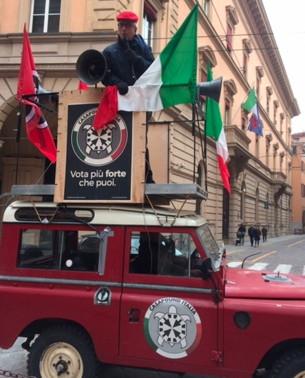Basco rosso in testa, bandiere tricolore e di CasaPound, jeep d’epoca con tanto di altoparlanti per i comizi. L’ex parlamentare di Msi, An e Pdl, sottosegretario nei governi Berlusconi, Filippo Berselli, candidato a Bologna con il movimento di estrema destra, ha cominciato questa mattina il suo tour elettorale in giro per la città. L’appuntamento era all’angolo tra via D’Azeglio e de’ Carbonesi, non lontano dal raduno antifascista di Pd, sindacati e sinistra in piazza del Nettuno, nell’ambito della mobilitazione dopo i fatti di Macerata.