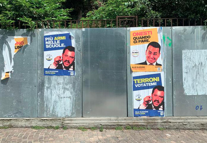 Finti manifesti elettorali con i volti di Matteo Salvini e Luigi Di Maio sono comparsi a Bologna in alcune bacheche destinate alla campagna elettorale per le Europee.