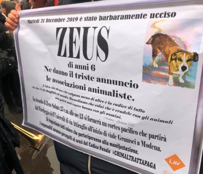 Oltre trecento persone hanno manifestato questo pomeriggio a Modena in via Toniolo, dove il 31 dicembre è stato trovato dalla polizia municipale, in un cassonetto dei rifiuti, un cane meticcio, ‘Zeus’, massacrato di botte e agonizzante.