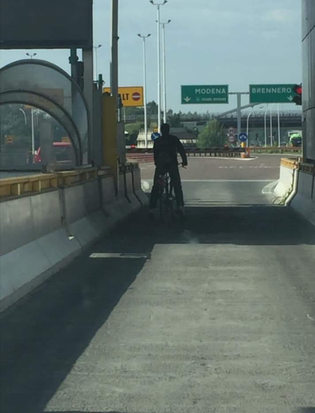 Con la bici tenta di entrare in autostrada dal casello di Carpi. E’ successo questa mattina sabato, 22 giugno. Un automobilista, Alessandro Bertesi, ha fotografato la scena. Chiaramente il ciclista è stato bloccato e fatto tornare indietro. Non si conoscono invece le intenzioni dell’uomo in bicicletta: non si sa quindi se volesse imboccare l’entrata per il Brennero o quella per Modena.
