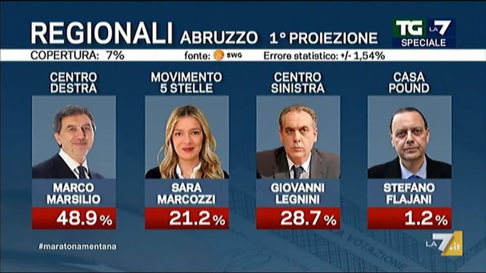 I seggi in Abruzzo si sono chiusi alle 23 con un’affluenza del 52,39% contro il 59,78% delle precedenti regionali (con 286 dei 305 comuni che hanno fornito il dato dei votanti). La prima proiezione Swg per La7 vede in testa con il 48,9% il candidato alla presidenza Marco Marsilio (centrodestra); Sara Marcozzi del Movimento 5 Stelle al 21,2%; Giovanni Legnini del centrosinistra al 28,7%; Stefano Flajani di Casa Pound all’1,2%. La copertura del campione è del 7%.