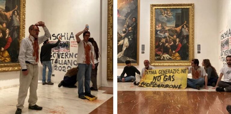 Altri tre attivisti hanno incollato, su una parete accanto al quadro, un’immagine di Casamicciola dopo la frana con didascalia “Strage degli innocenti”, riportando i nomi delle giovanissime vittime del disastro. Sulla stessa parete hanno scritto: “Ischia, Governo italiano 2022”.