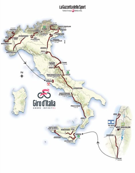 Il finanziamento israeliano alle tre tappe del Giro d’Italia in Israele rischia di essere annullato. In un comunicato congiunto i ministri Miri Regev (sport e cultura) e Yariv Levin (turismo) avvertono che ”nella misura in cui nel sito del Giro non sarà cambiata la definizione che qualifica come punto di partenza ‘West Jerusalem’, il governo israeliano non partecipera’ alla iniziativa”. “Gerusalemme – precisano – è la capitale di Israele: non vi sono Est e Ovest”.