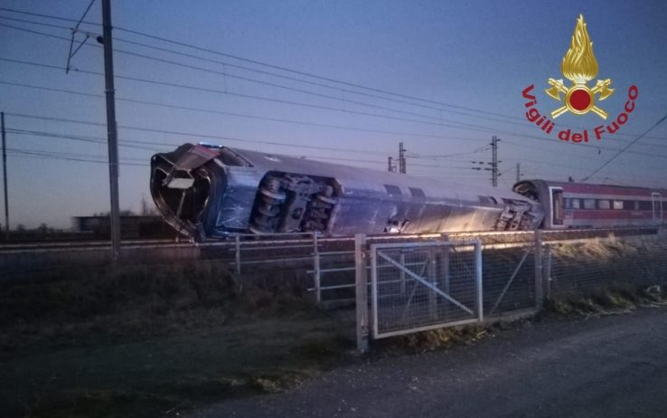 Sul posto i Vigili del Fuoco e i mezzi di soccorso. Tutti i treni, in entrambe le direzioni, sono stati instradati sulla linea convenzionale Milano-Piacenza con ritardi fino a 60minuti.Lo rende noto Rete Ferroviaria Italiana. Almeno due vagoni, oltre alla motrice del Frecciarossa, si sono ribaltati in seguito all’incidente avvenuto a Livraga (Lodi). Ancora sconosciute le cause. I vigili del fuoco sono al lavoro per estrarre i passeggeri dalle lamiere. L’unico ferito in condizioni più gravi rispetto agli altri coinvolti, inviati in codice verde o giallo, è un pulitore delle ferrovie, quelli che si trovano generalmente a bordo dei treni Av a disposizione dei passeggeri.L’uomo, secondo quanto riferito dalle forze dell’ordine sul posto, non sarebbe comunque in pericolo di vita. Anche le due vittime accertate, al momento, sono personale delle ferrovie. Secondo le forze dell’ordine la motrice del convoglio, dopo essere sviata dai binari per cause ancora da chiarire, sarebbe uscita completamente dalla sede finendo prima contro un carrello o qualche mezzo analogo che si trovava su un binario parallelo, e poi contro una palazzina delle ferrovie, dove ha terminato la sua corsa. Il resto del convoglio avrebbe invece proseguito la corsa ancora un pò con la seconda carrozza che ad un certo punto si sarebbe ribaltata.
