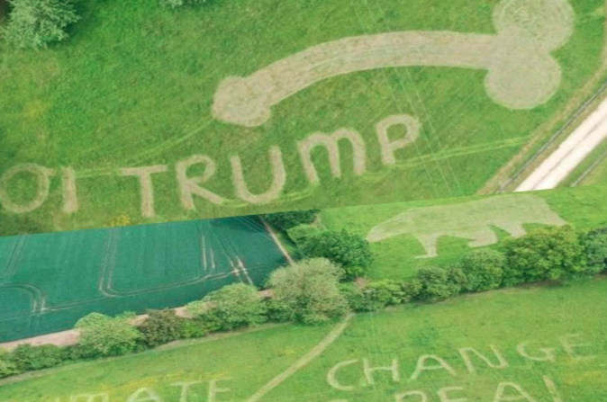 Donald Trump è sbarcato a Londra per una visita di tre giorni in Gran Bretagna. Poco prima di atterrare, però, il presidente Usa ha trovato una sgradita sorpresa: lo studente ambientalista Ollie Nancarrow ha infatti disegnato, su un prato nei pressi dell’aeroporto di Stansted, un pene corredato dalla scritta: “Hei Trump, il cambiamento climatico è reale”. L’intenzione del 18enne era quella di rendere ben visibile il suo “benvenuto” dai finestrini dell’Air Force One.