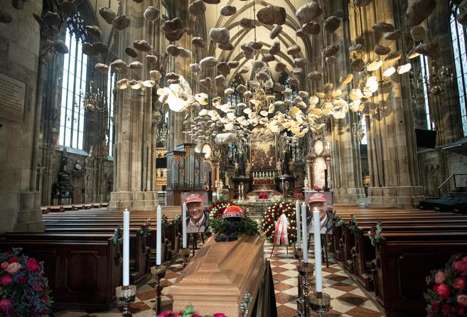 Sulla bara è stato posto il casco rosso del pilota, che porta il suo nome in lettere bianche. E’ previsto che pronuncino, durante il funerale, orazioni funebri il presidente della Repubblica austriaca, Alexander Van der Bellen, l’ex pilota francese Alain Prost e l’austriaco Gerhard Berger, e l’attore hollywoodiano di origine austriaca Arnold Schwarzenegger. Non è stato ancora rivelato dove Lauda verrà sepolto.