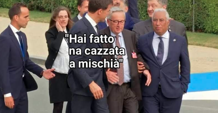 “Questo signore è il capo del Governo di 500 milioni di europei, un signore che arriva da un paradiso fiscale come il Lussemburgo. Se cercate su google ‘Juncker sobrio’ o ‘barcollante’, vedrete immagini a volte impressionanti”.