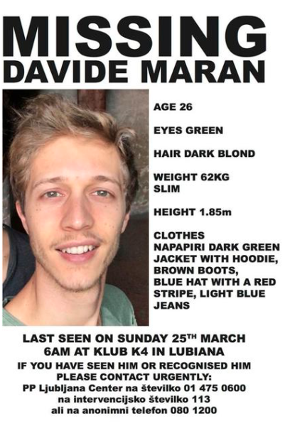 Un imprenditore del Cadore, nel Bellunese, avrebbe visto Davide Maran mentre faceva l’autostop. L’uomo avrebbe visto un giovane mentre andava a casa e poi guardando il telegiornale non avrebbe avuto dubbi. La segnalazione è stata girata alla famiglia. Riscontri anche da un bar di Dosoledo, sempre nel Bellunese. L’ultimo accesso ai social di Maran è del 23 marzo. Dal 25 il telefono risulta staccato. Le indagini proseguono nel più stretto riserbo. Le autorità italiane e slovene sono al lavoro insieme alle forze dell’ordine e alla famiglia; anche la Farnesina sta seguendo il caso.