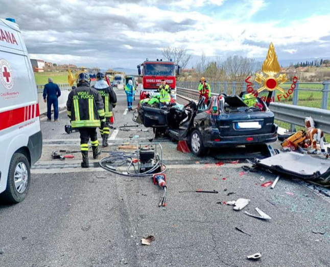 Terribile incidente mortale oggi alle 15.15, sabato 9 aprile, sulla E45 al chilometro 141, tra Madonnuccia e Sansepolcro Nord. A perdere la vita un 79enne di Pieve Santo Stefano che, alla guida di un’auto ha colpito il new jersey ribaltandosi per poi investire una Peugeot che viaggiava in direzione opposta con a bordo due 47enni residenti a Foligno. Questi sono rimasti feriti. La più grave è risultato una donna trasportata con l’Elisoccorso atterrato in proprio sulla carreggiata della E45 E45. La strada è rimasta chiusa a lungo. Sul posto i Vigili del Fuoco di Sansepolcro e Città di Castello insieme alla Polizia Stradale.