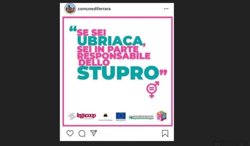 Nel post ‘incriminato’, che fa parte di una campagna a cui partecipano anche Legacoop Estense e la Regione Emilia Romagna e L’Unione Europea (i cui loghi compaiono nell’immagine), e’ riportata, tra virgolette, la frase “Se sei ubriaca, sei in parte responsabile dello stupro”. Nella didascalia, invece, si legge “L’assunzione di alcol e droghe ti rende in parte responsabile dello stupro che hai subito”, seguita da una ‘x’ rossa e dalla frase “Lo pensa il 15% degli italiani”.