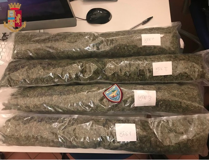 Andava in giro portando un trolley con dentro 2,2 kg di marijuana, a suo dire ‘cannabis light’ destinata alla vendita nei negozi specializzati. Ma le verifiche della Polizia hanno rivelato che la percentuale di Thc era più alta del limite di legge e si trattava quindi di droga illegale.