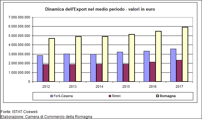 Nell’area Romagna – Forlì-Cesena e Rimini, i dati di fonte ISTAT Coeweb per l’anno 2017, rilevano una crescita, rispetto al 2016, dei flussi commerciali da e verso l’estero. È soprattutto l’export a crescere con l’aumento del valore esportato dei principali prodotti e i la crescita dei relativi flussi verso le più importanti aree geografiche.