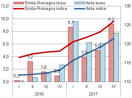 Export sempre motore dell’economia dell’Emilia-Romagna. Nel quarto trimestre 2017 accelerano nuovamente (+9,2 per cento) le vendite all’estero dell’Emilia-Romagna, risultate pari a 15.692 milioni di euro. E’ quanto attestano i dati Istat delle esportazioni delle regioni italiane, analizzati da Unioncamere Emilia-Romagna.