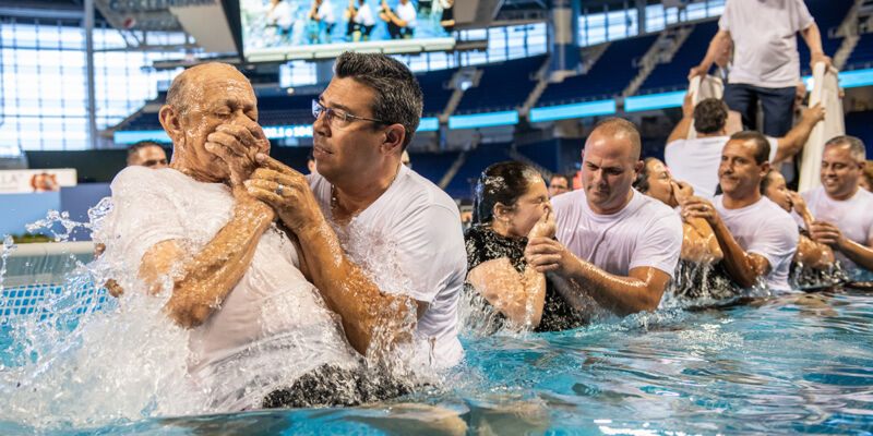 Il battesimo è sempre uno dei momenti più attesi dei raduni dei Testimoni di Geova Come per i 57 nuovi fedeli di Rimini avviene per immersione totale in acqua, seguendo il modello descritto nei Vangeli del battesimo di Gesù, che fu immerso nel fiume Giordano. Lo scorso anno i nuovi battezzati in Italia sono stati circa 3.200 e nel mondo oltre 145.000.