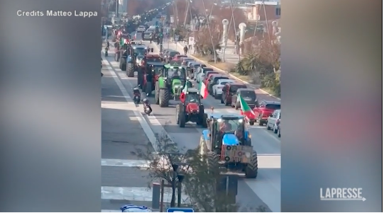 Sono oltre un centinaio i trattori che stanno sfilando in corteo a Pescara per protestare contro le politiche comunitarie. Gli agricoltori hanno attraversato i 30 km del capoluogo adriatico e hanno raggiunto Montesilvano, ai confini con Pescara: ora stanno tornando indietro ripercorrendo Viale Matteotti e raggiungendo Piazza Italia dove ha sede la prefettura ma anche la Provincia dell’Aquila e Palazzo di città, il Comune di Pescara. I trattori rientreranno nel presidio dell’ex mercato ortofrutticolo Cofa. Manifestano perché la Ue non tagli i sussidi, per rivedere i prezzi all’ingrosso per l’agro solare e gli impianti fotovoltaici, e si uniscono alle proteste dei loro colleghi tedeschi. Video: https://www.lapresse.it/cronaca/2024/01/27/video-pescara-la-protesta-dei-trattori-arriva-in-centro-citta/