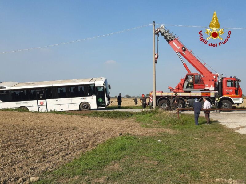 Un autobus era uscito di strada appoggiandosi con un fianco fuori strada, con all’interno 10 persone. Le squadre giunte sul posto insieme al personale di Romagna Soccorso, provvedevano ed estrarre dal mezzo l’autista mentre gli altri occupanti uscivano autonomamente dalle uscite di sicurezza del mezzo.