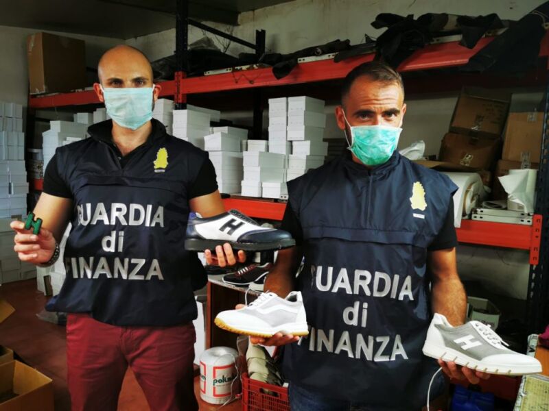 Le indagini della Finanza hanno permesso di risalire anche al luogo di approvvigionamento: un’abitazione alla periferia di Montegiorgio, nel fermano, dove era allestito un laboratorio. Qui erano prodotte le scarpe vendute nel negozio di Bellaria Igea Marina. Le “fiamme gialle” hanno sequestrato 500 paia di Hogan contraffatte, accessori e componenti di pelle riproducenti la “H” e le “fustelle” in metallo per il taglio del pellame, occorrenti per riprodurre la “H” del marchio. Il titolare del laboratorio artigianale, è stato pure denunciato.