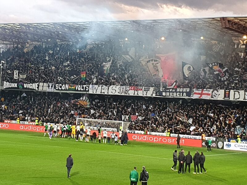 INFARTI E STRISCIONI – Ad inizio ripresa il Rimini rischia di combinare la frittata (leggasi autogol): Galeotti è reattivo. Portiere biancorosso sul pezzo anche al 67’, in occasione del colpo di testa sferrato da Corazza. Tre minuti dopo occasionissima della Gaburro-band: il diagonale di Santini si perde a lato di un nulla. Brividi. Brividi veri. E, mi sa, pure qualche infarto fulminante sugli…spalti. Tozzo al 75’ dice no a Gabbianelli. Il Cesena pare ora in apnea. Ma al minuto ottantaquattro arriva il gol che squassa la Curva Mare. E che decide il derby. A firmarlo è, in semi-rovesciata, il bomber per un giorno Prestia. Arriva l’assedio (finale) riminese. Ma il Cavalluccio (che, in attesa di vedere cosa combinerà alle 17.30 la Reggiana con il Siena, si porta a -2 dalla vetta) non rischia nulla. Prima di chiudere, nota di merito per due striscioni. Il primo, apparso sul fronte riminese, recitava ‘Vi credete il centro della Romagna, siete solo il Romagna Centro’. Il secondo, che ha fatto capolino sul versante cesenate, diceva ‘Riminese Scalabrelli’. Applausi. Fragorosi.
