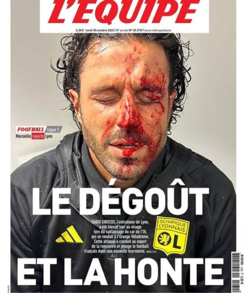“Il disgusto e la vergogna“. Questo il titolo del quotidiano francese ‘L’Equipe‘ che pubblica in prima pagina il volto sanguinante di Fabio Grosso, tecnico del Lione, che ha riportato ferite al viso e alla testa, dopo che il pullman della squadra, nel tragitto verso ìl ‘Velodrome’ di Marsiglia, per la sfida di Ligue 1 contro l’Olympique di Rino Gattuso, è stato oggetto di una sassaiola da parte degli ultras del Marsiglia. Il lato destro del veicolo ha subito i danni maggiori con diversi finestrini che sono esplosi. Il posticipo della decima giornata di Ligue1, è stato rinviato a data da destinarsi in seguito agli incidenti verificatisi fuori dallo stadio. https://www.lapresse.it/calcio/2023/10/30/calcio-grosso-sanguinante-su-prima-pagina-lequipe-il-disgusto-e-la-vergogna/