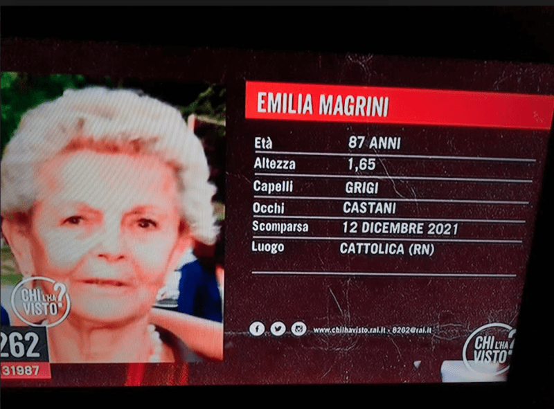 Sono trascorsi sei mesi dalla scomparsa di Emilia Magrini di 87 anni dalla sua abitazione di Cattolica un provincia di Rimini. Era infatti il 12 dicembre del 2021 quando la donna era sparita nel nulla. Nonostante il notevole sforzo messo in campo, le ricerche non hanno dato esito. Ricerche, che hanno impegnato una cinquantina di personeIl 12 dicembre 2021 era domenica. La donna, subito dopo pranzo, era uscita di casa per una passeggiata. Da quel momento nessuno ha più avuto sue notizie. Così la prefettura di Rimini, all’indomani dell’allarme dato dalla figlia, ha iniziato le operazioni di ricerca che hanno interessato non solo il territorio di Cattolica, ma anche i comuni limitrofi, come San Giovanni, Gabicce, Misano e Gradara e Rimini. Per tutta la settimana, in quei giorni, gli elicotteri hanno sorvolato senza sosta Cattolica e l’entroterra, insieme a una piccola flotta di droni dei vigili del fuoco. Erano stati attivati anche i cani molecolari specializzati nel ritrovamento dei dispersi. Purtroppo senza esito. Le ultime notizie della signora Emilia Magrini risalgono al pomeriggio di domenica 12 dicembre quando era uscita di casa per fare una passeggiata. All’imbrunire, non vedendola tornare, i parenti avevano fatto scattare l’allarme ed erano state diramate le prime ricerche. Erano giorni molto freddi e c’era molta preoccupazione. I famigliari non sanno darsi pace. Emilia al momento della scomparsa aveva un piumino lindo e nero. Emilia è alta 1,65 e ha capelli grigi.