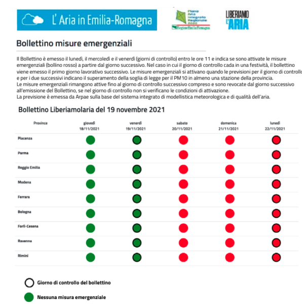 Sulla base delle previsioni formulate circa la probabilità di superamento del valore limite giornaliero di PM10 per i prossimi giorni a partire da quello di controllo, a Cesena e nel resto della nostra regione, scattano le misure emergenziali indicate dal PAIR – Piano Aria Integrato Regionale per combattere lo smog. In particolare, è previsto lo stop alla circolazione di tutti i veicoli diesel euro 4 (o inferiori) dalle 8,30 alle 18,30 nell’area urbana già interessata dalle altre limitazioni del traffico. Inoltre, per tutti i veicoli sarà vietata la sosta con motore acceso.